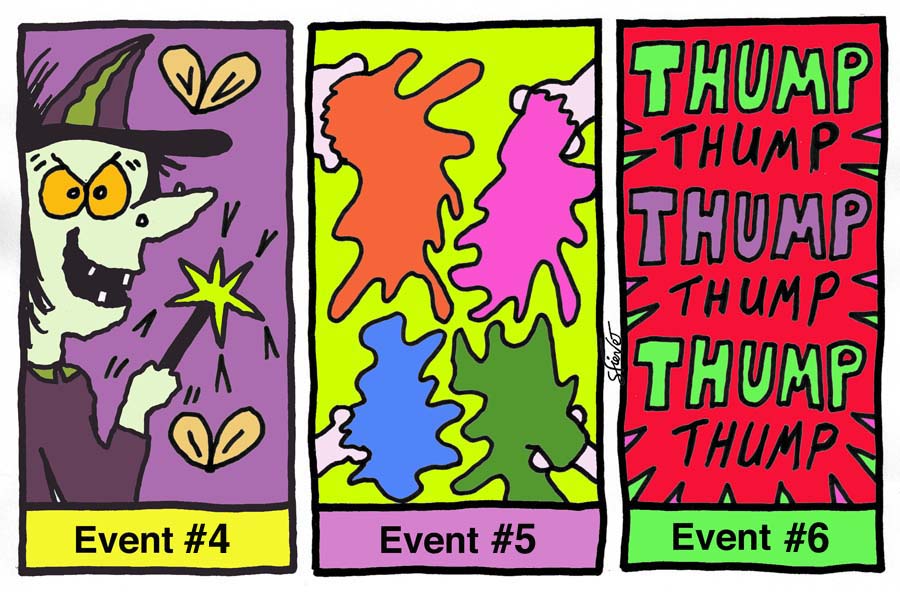Can you hear the song that is playing at the party? It's "Jingle Jangle" by The Archies. Everybody loves this song so they begin to dance. But of all the dancers YOU are the very best. Everyone is looking at you and applauding. This is already a great party, isn't it? Of course it is. Now let's look at the Schedule of Events (twelve in all) that will happen in real time as you are reading them.